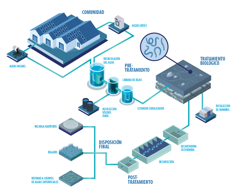 El agua residual es tratada en su totalidad, por lo que no se generan lodos, sino que un fertilizante denominado humus, el que puede ser utilizado o vendido.